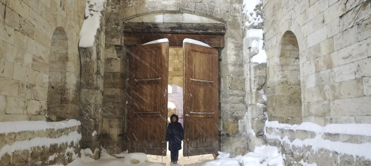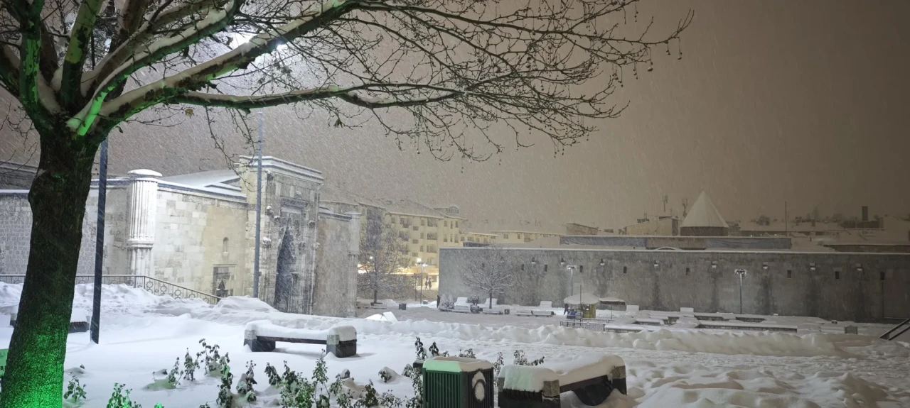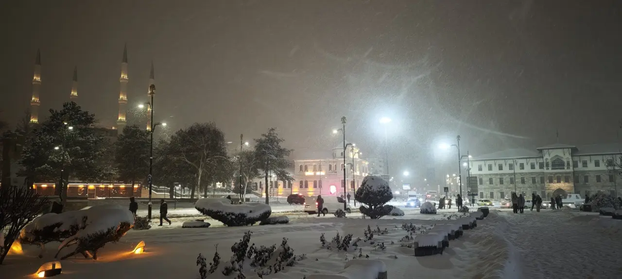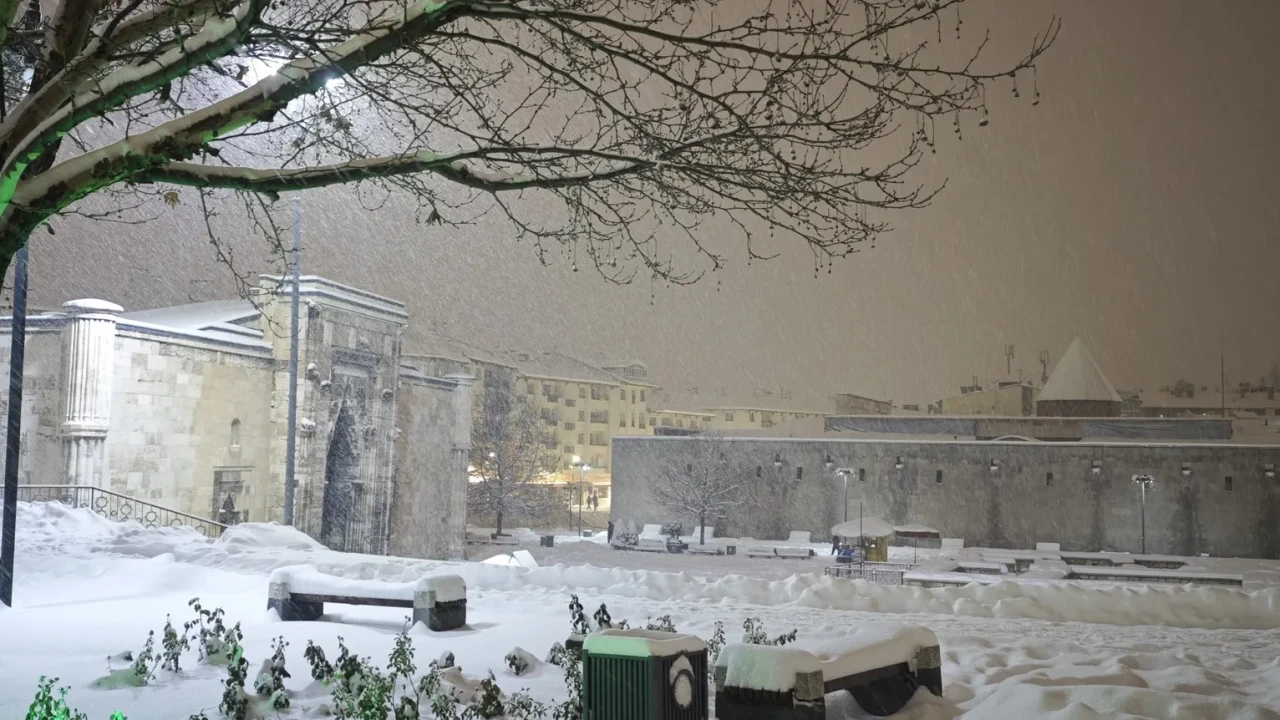 Tarihi Kent Meydanı beyaz örtüyle kaplandı. Selçuklu ve Osmanlı dönemi eserleri karla birlikte büyüleyici bir görünüm kazandı.