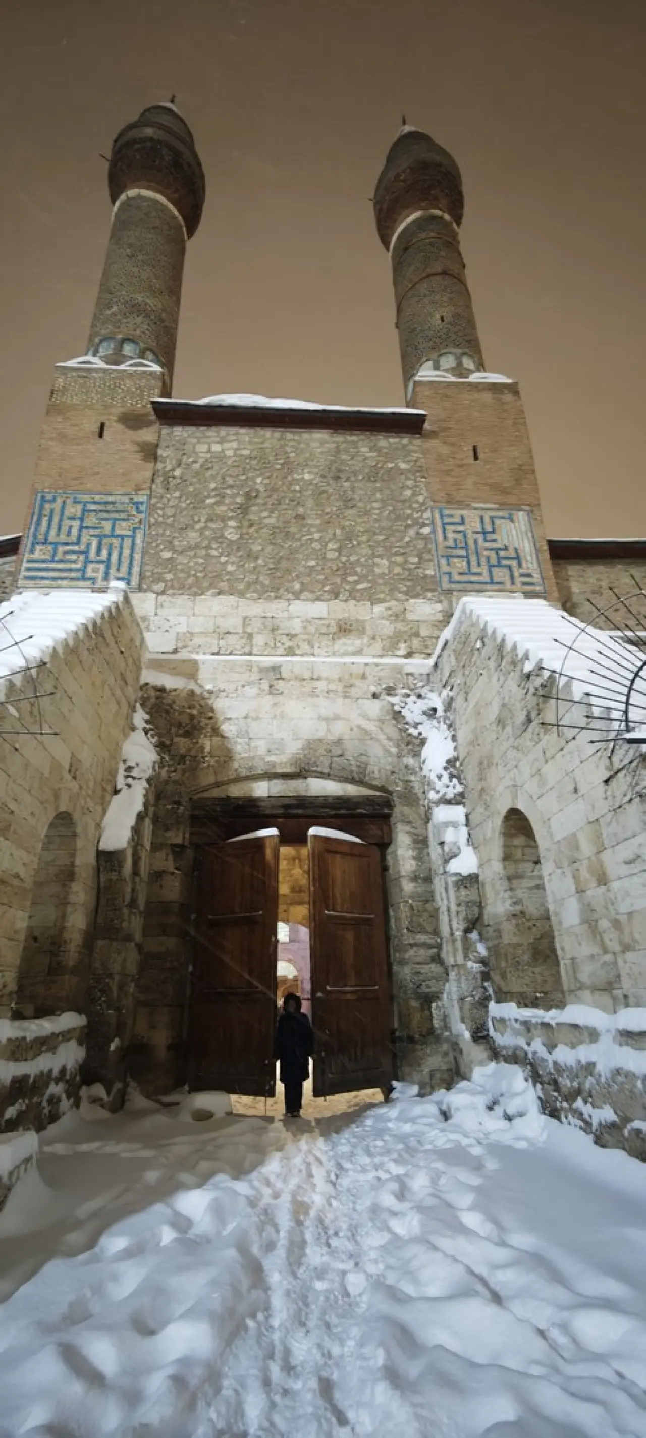 Şifahiye Medresesi ve Çifte Minareli Medrese buz sarkıtlarıyla süslendi. Tarihi yapıların çatılarında bir metreyi bulan buzlar oluştu.