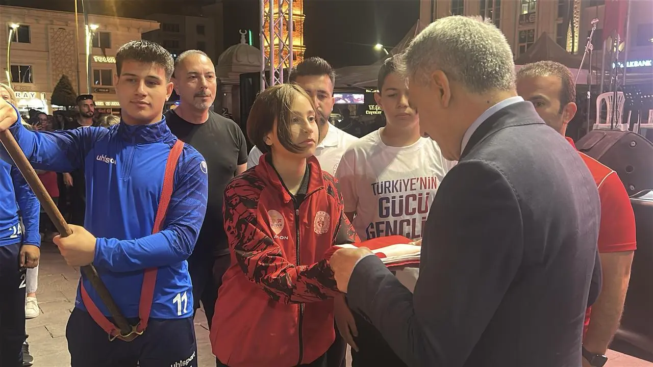 Türk bayraklarıyla Cumhuriyet Meydanı’na yürüyen kalabalığa il protokolü ve bando ekibi eşlik etti. Saygı duruşu ve İstiklal Marşı ile program başladı.