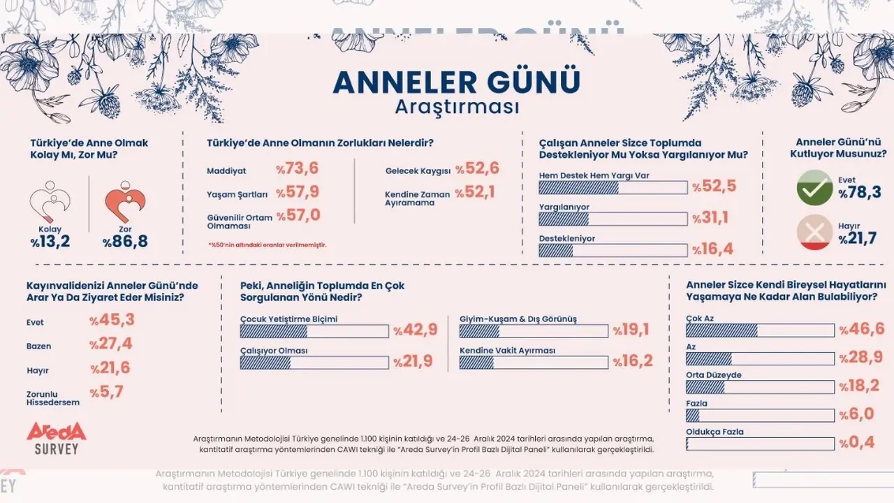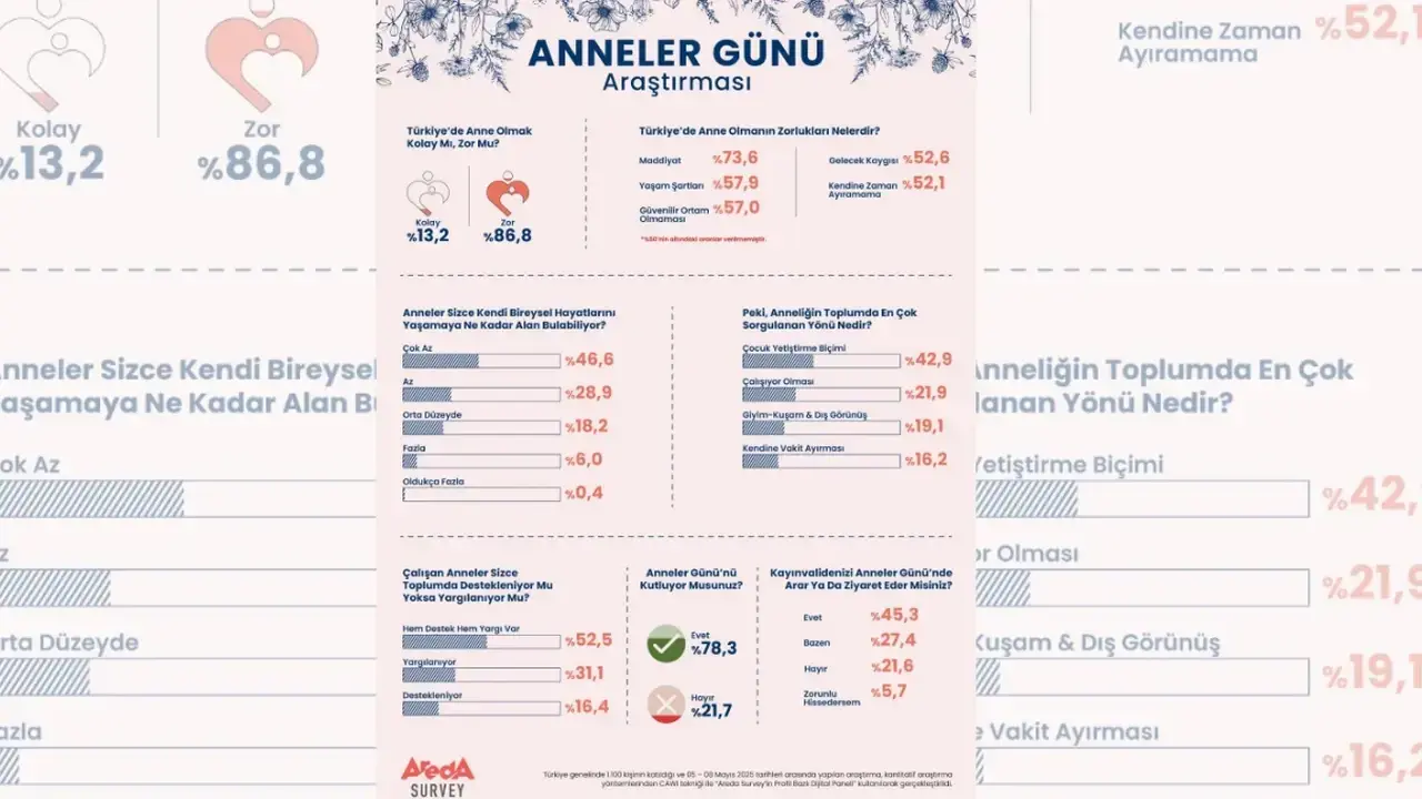 Areda Survey tarafından 5-8 Mayıs 2025 tarihleri arasında Türkiye genelinde 1100 kişiyle gerçekleştirilen araştırma, anneliğin zorluklarına dair çarpıcı sonuçlar ortaya koydu. Araştırmaya göre, katılımcıların ezici çoğunluğu (%86,8) Türkiye'de anne olmanın zor olduğunu düşünüyor.