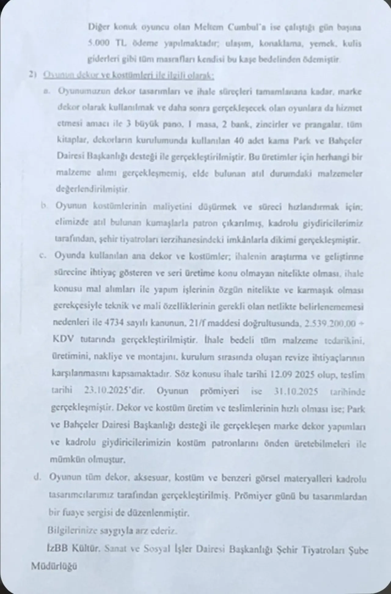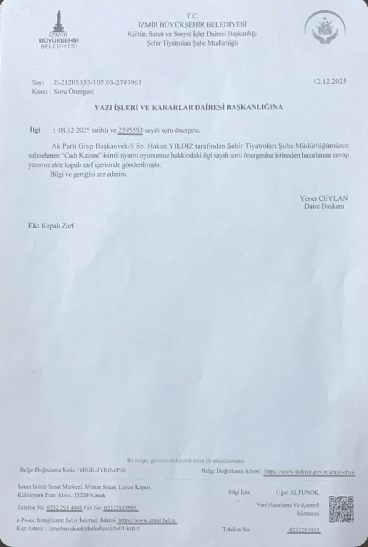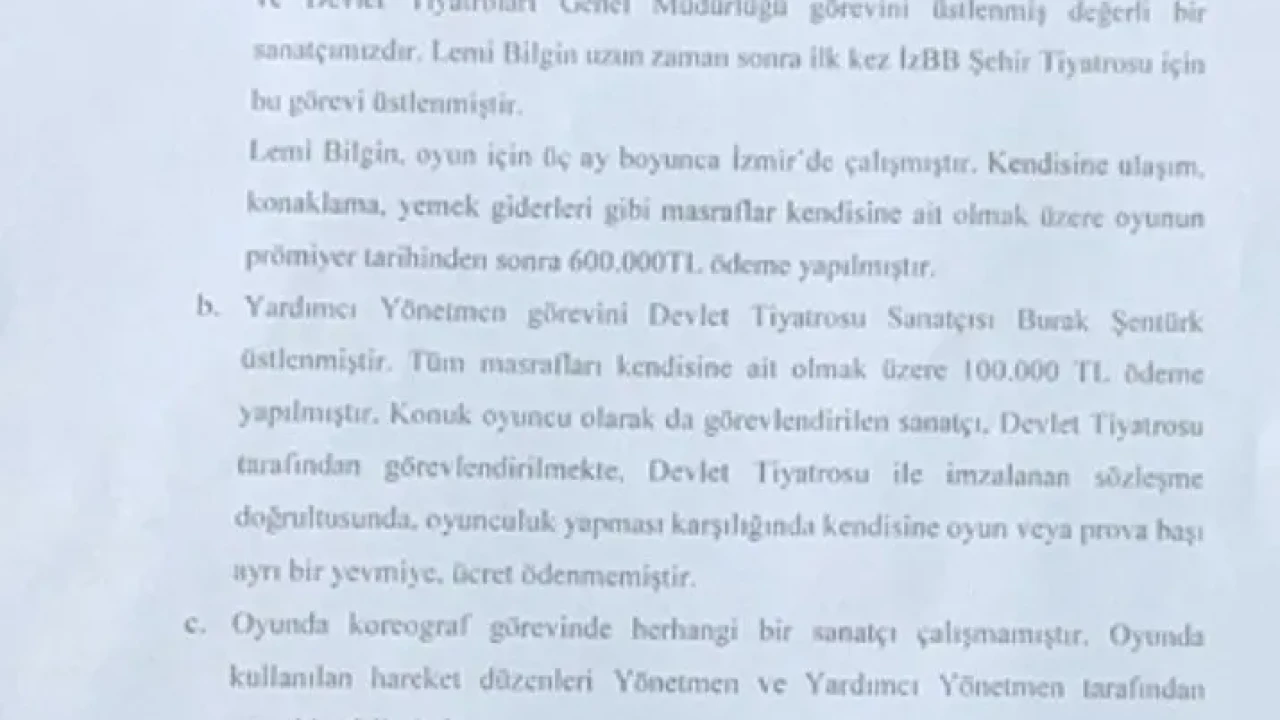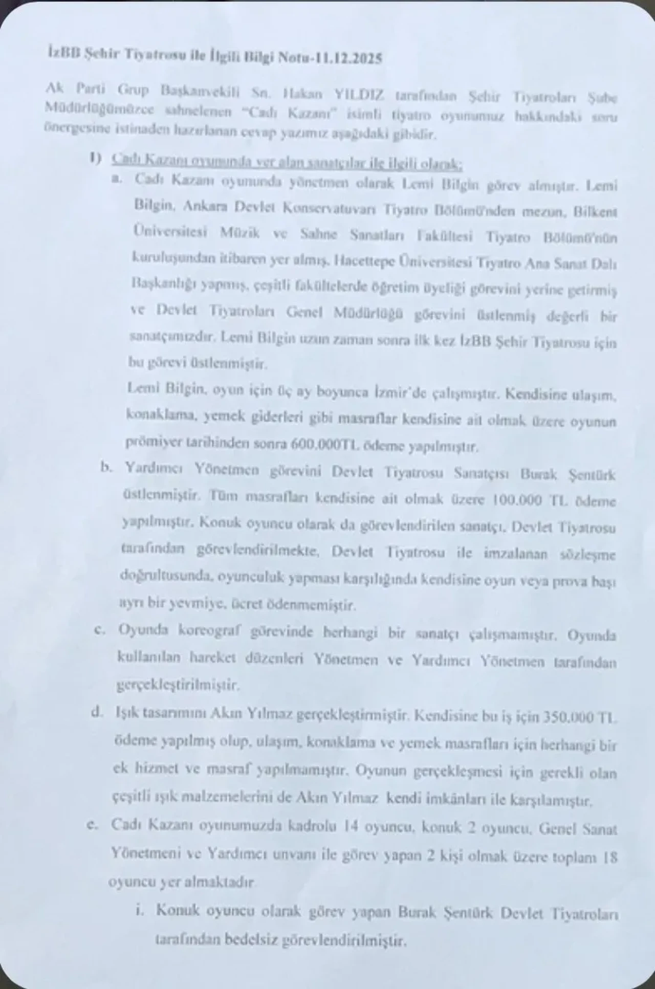 AK Partili Yıldız, İzmir Şehir Tiyatroları'nın yönetimini ve harcamalarını eleştirerek tepki gösterdi. Tek bir oyun için 4 milyon lira harcandığını belirtti.