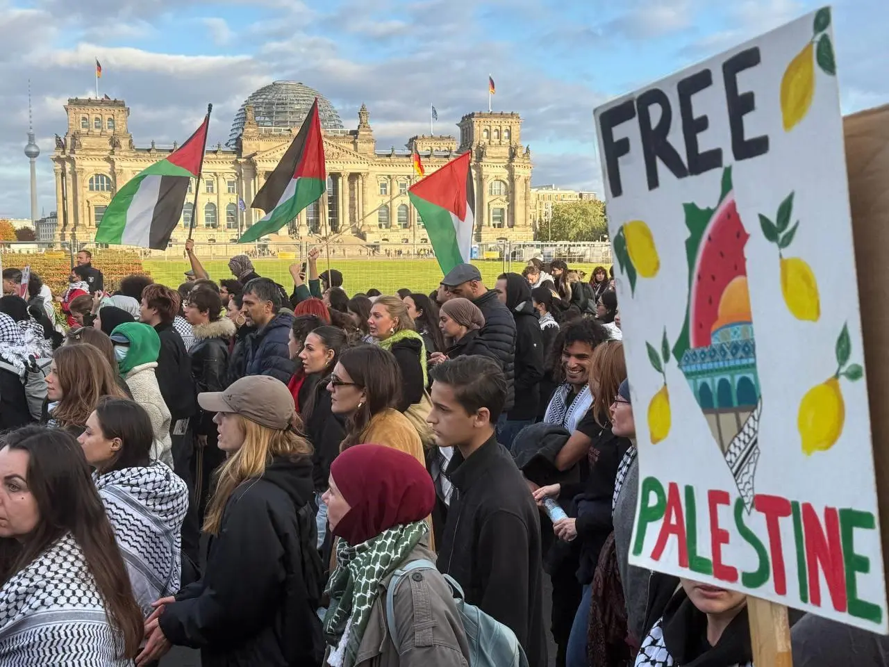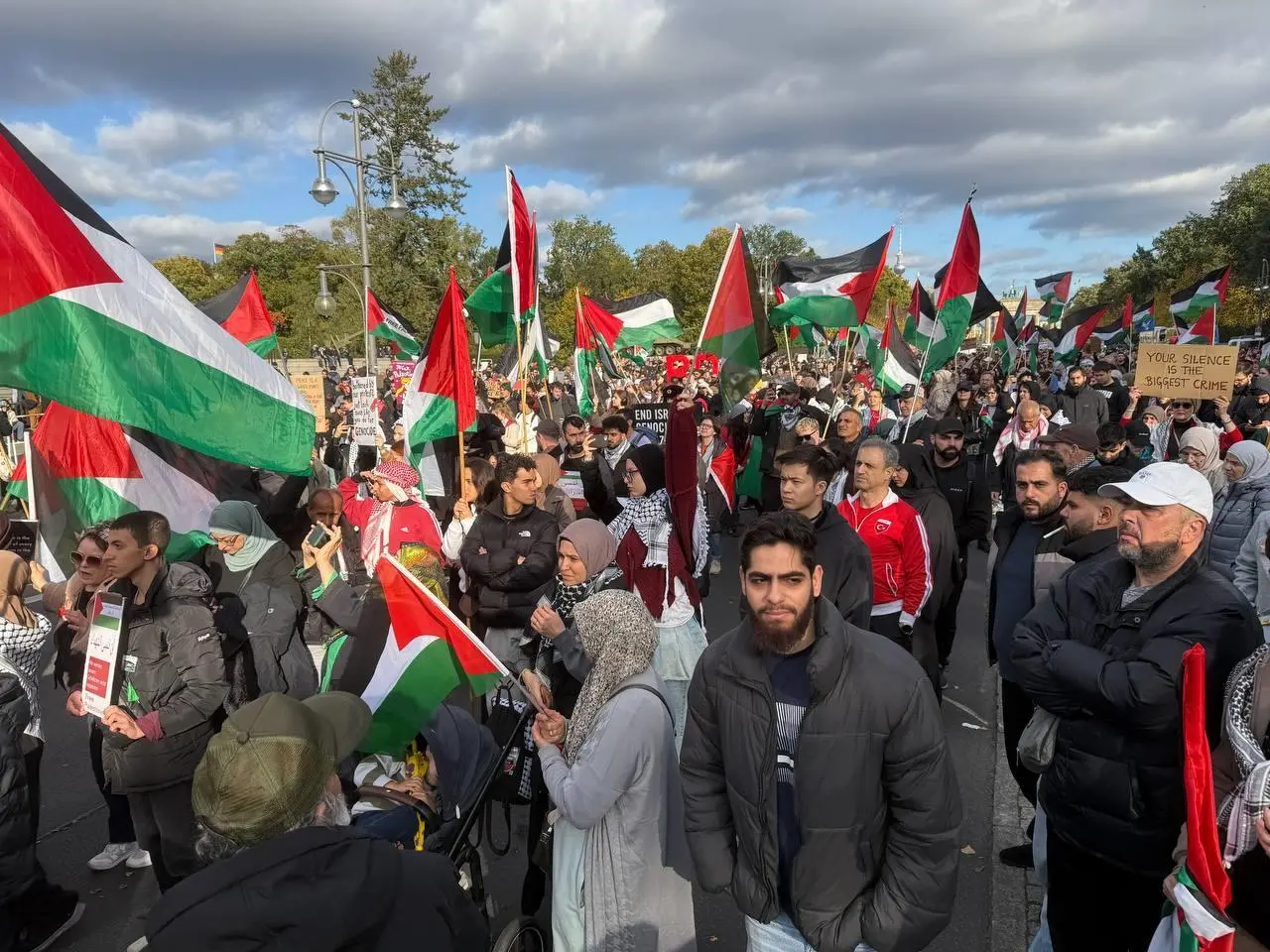 Göstericiler, Brandenburg Kapısı önünde Filistin bayraklarıyla toplandı. Gazze'deki sivil ölümlere tepki gösterildi ve İsrail'in katliamları kınandı.