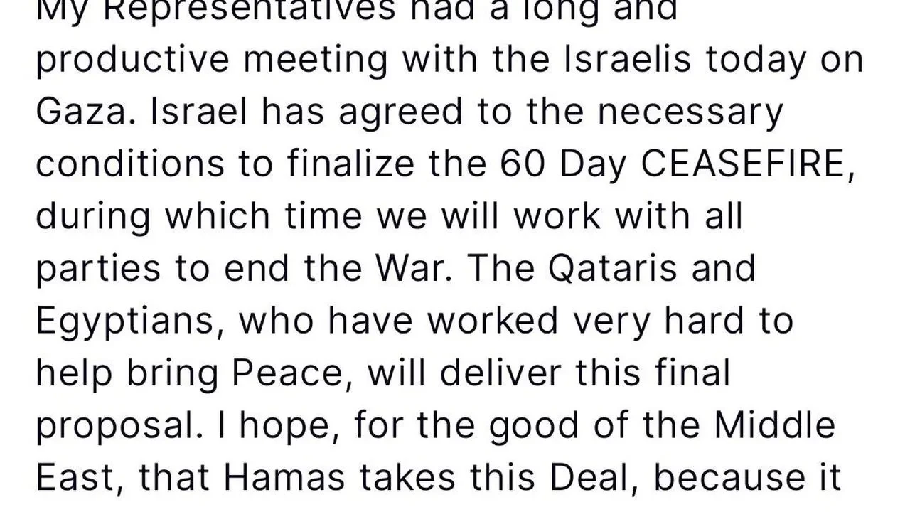 Amerika Birleşik Devletleri Başkanı Donald Trump, İsrail'in Gazze'de 60 günlük ateşkes için gerekli koşulları kabul ettiğini duyurdu.