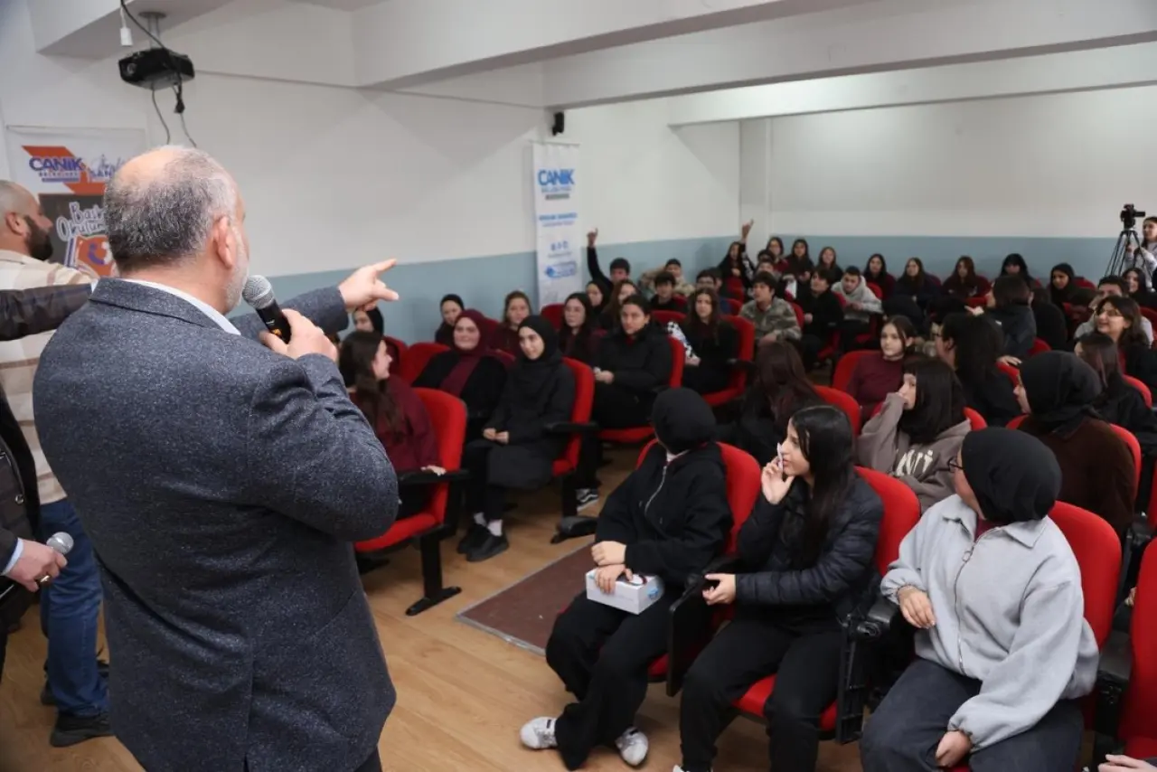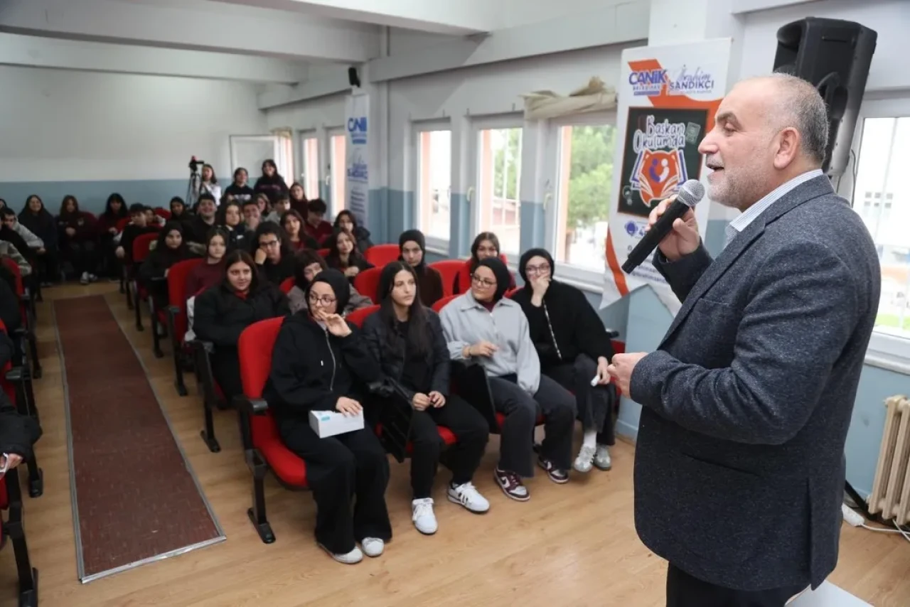 Başkan Sandıkçı, ‘Başkan Okulumda’ programı kapsamında Canik Karşıyaka Anadolu Lisesi öğrencileriyle bir araya geldi. Öğrencilerin taleplerini dinleyerek eğitim alanındaki çalışmalarını anlattı.