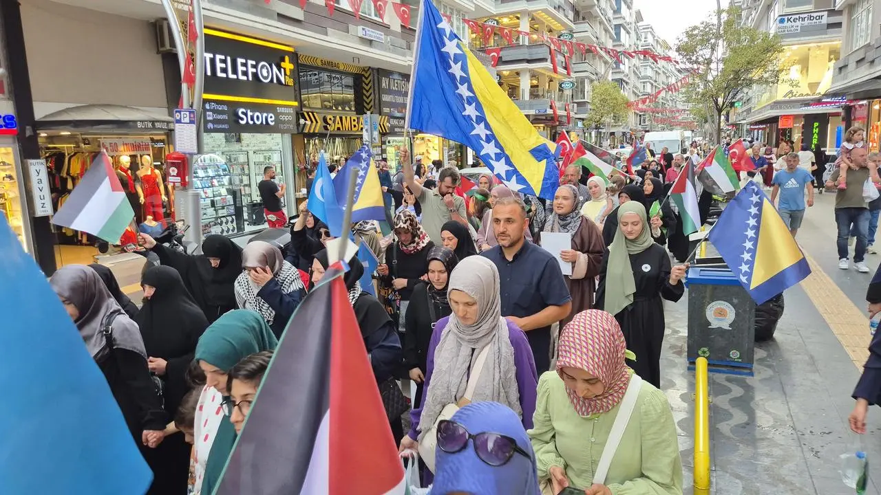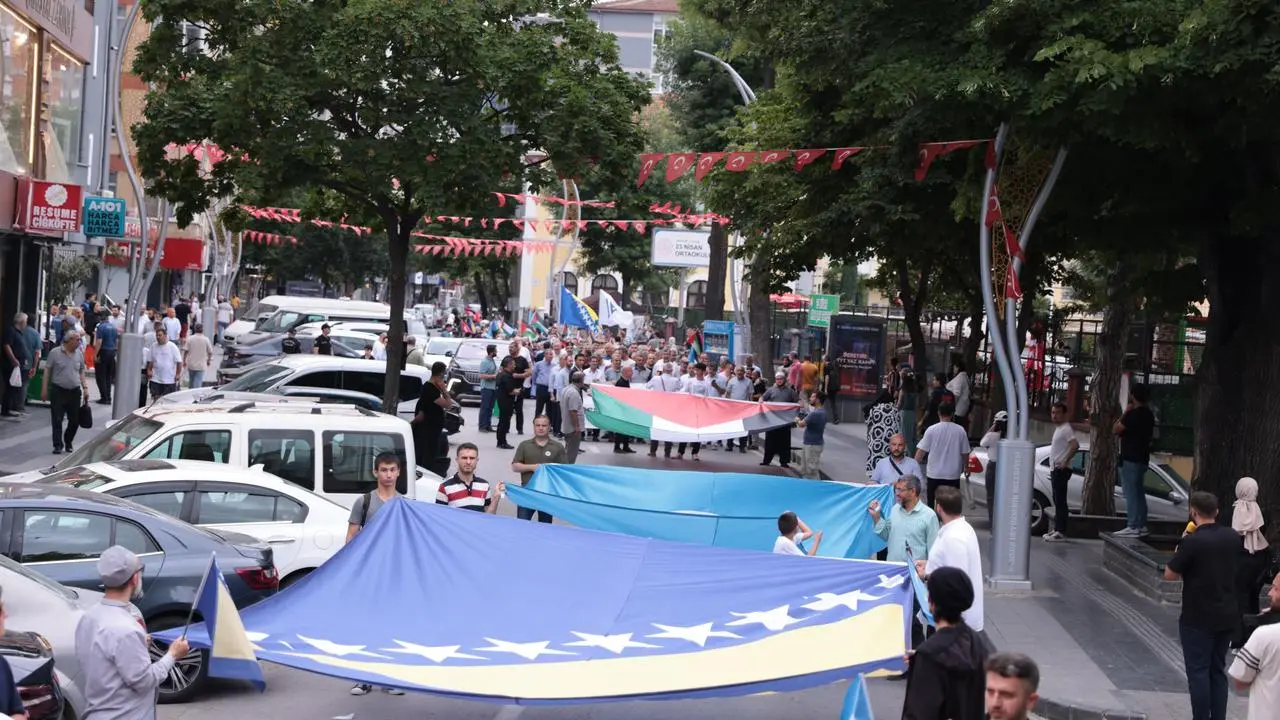 23 Nisan Ortaokulu önünden başlayan yürüyüş, İstiklal ve Gazi Caddeleri'nden geçti. Cumhuriyet Meydanı'nda son bulan etkinlikte Bosna, Filistin ve Doğu Türkistan bayrakları taşındı.