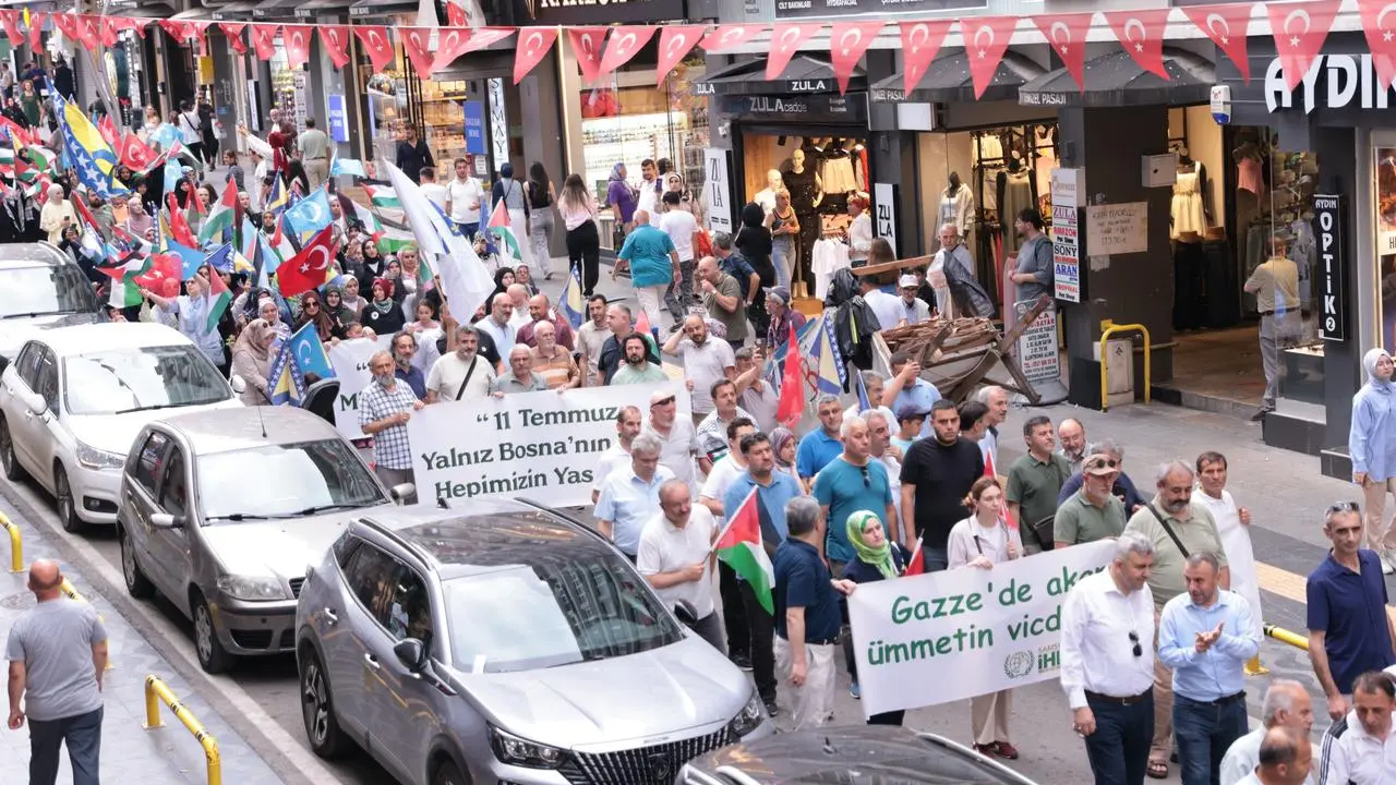 Katılımcılar, 8 binden fazla insanın öldürüldüğü soykırımı protesto etti. Gazze ve Doğu Türkistan'daki zulümlere de dikkat çekildi.
