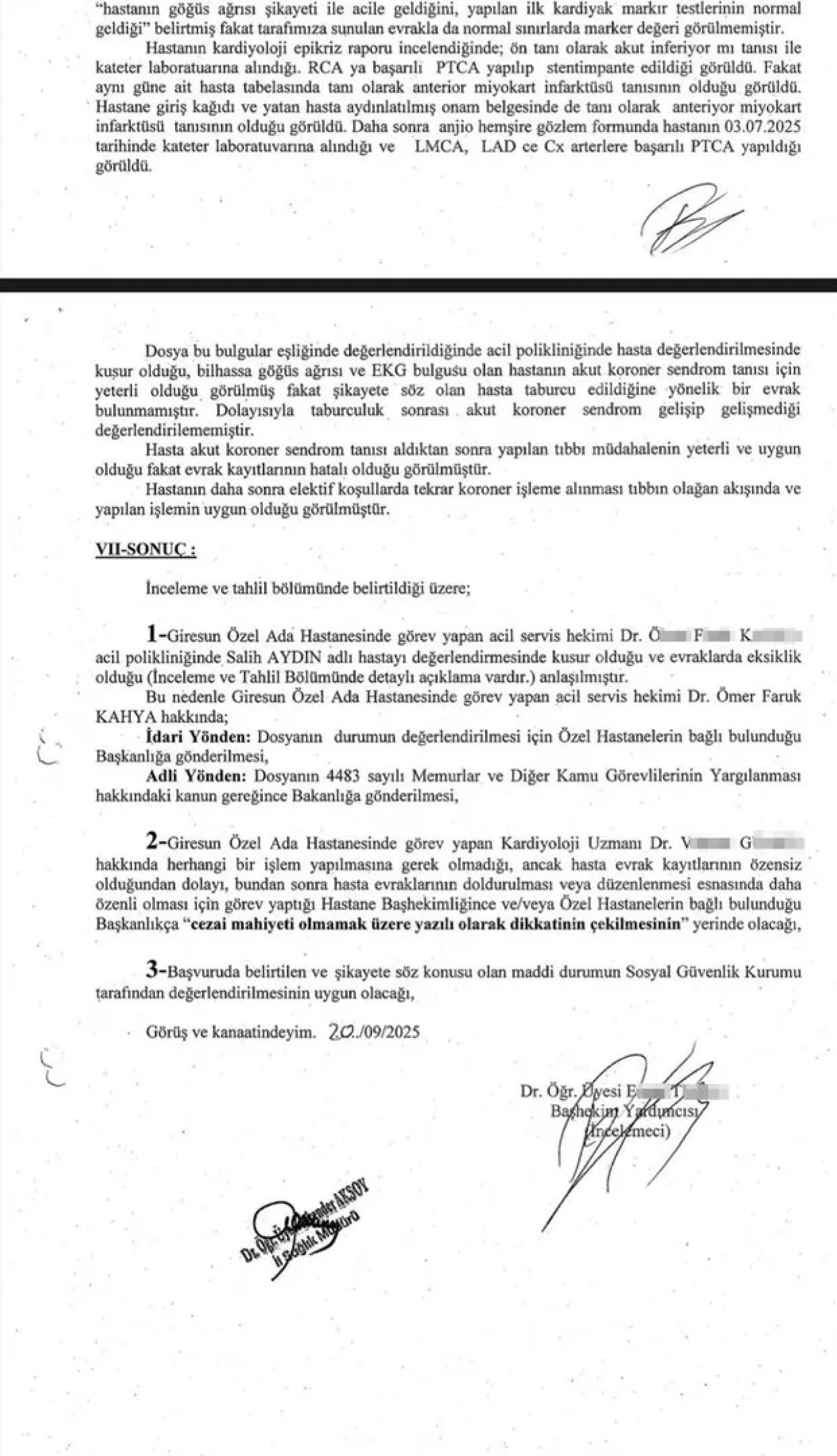 Sağlık Bakanlığı raporunda hekimin kusurlu olduğu belirtildi. Hastanın hayatta kalmasının şans faktörüne bağlı olduğu ifade edildi.
