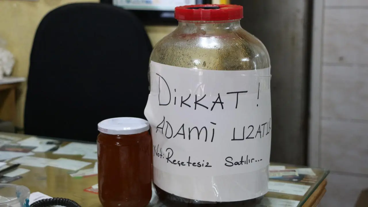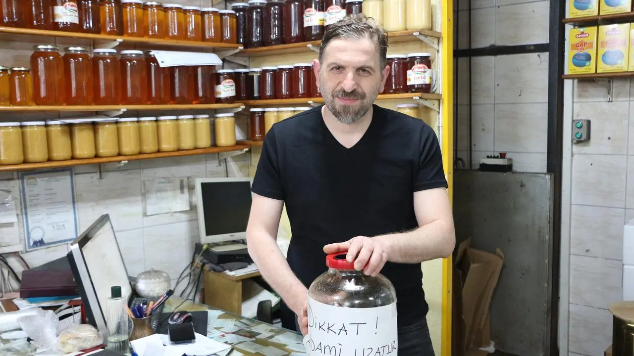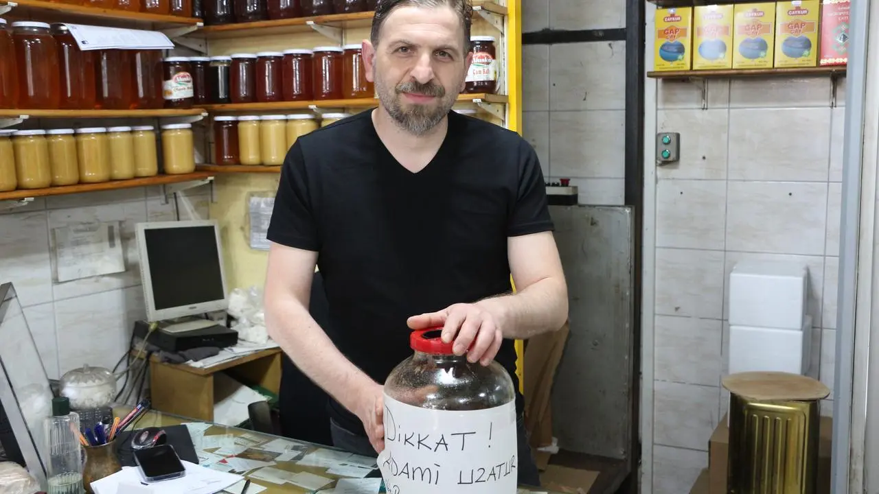 Rize'de deli bal satan bir esnaf, ürünün tehlikeli etkilerine dikkat çekmek için kavanoza 'Adami uzatur' notu yazarak ilgi çekti.
