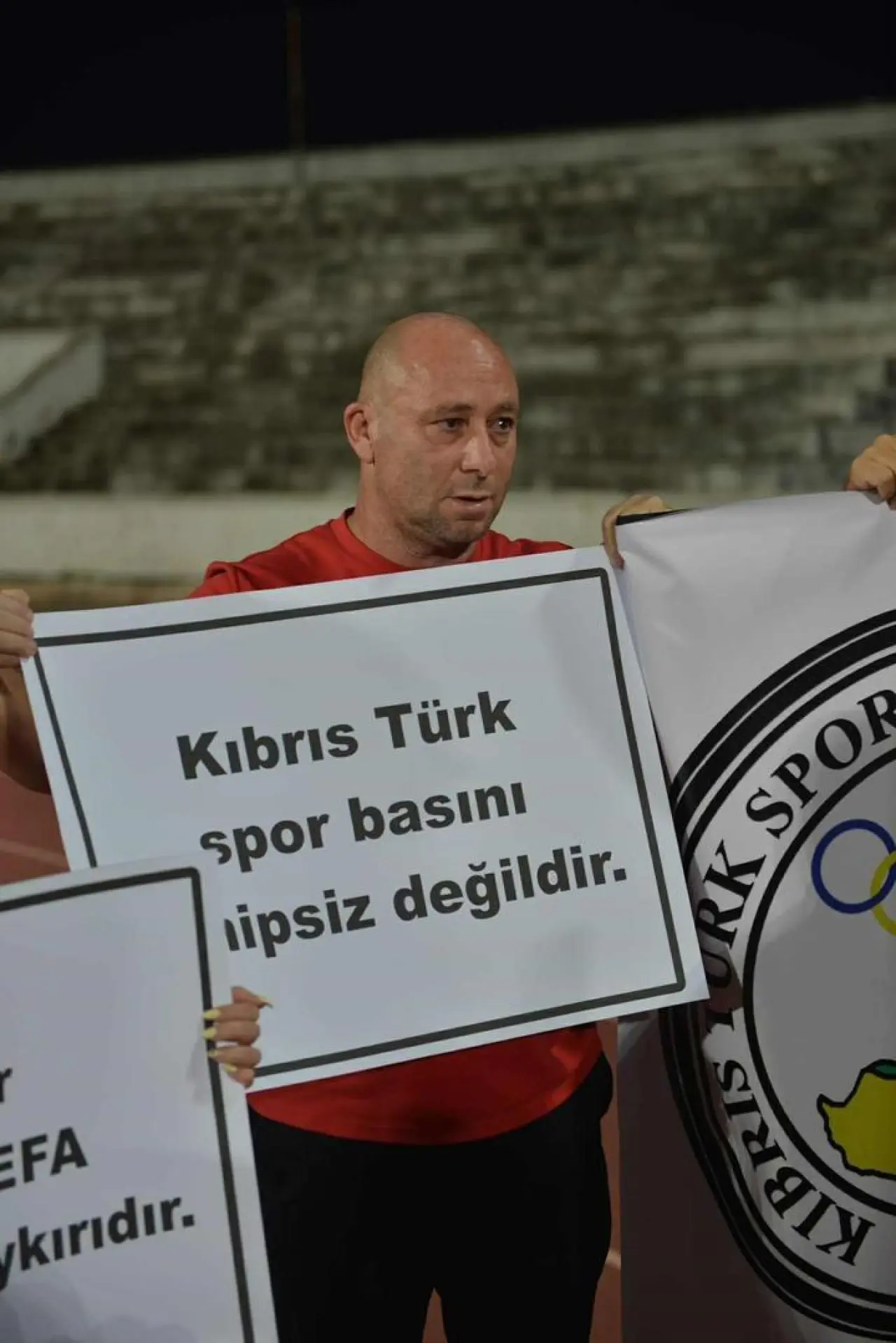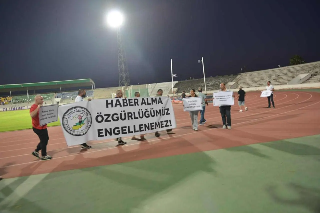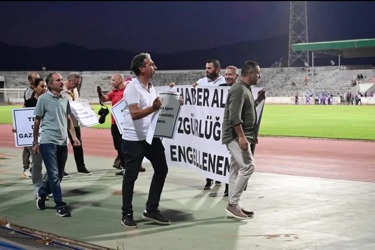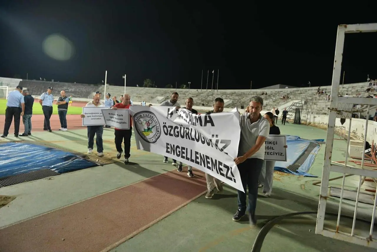 Süper Kupa maçında spor yazarları, haber alma özgürlüklerine dikkat çekmek için sahada eylem gerçekleştirdi. BASIN-SEN'in destek verdiği eylemde KTSYD yöneticileri açıklamalarda bulundu.