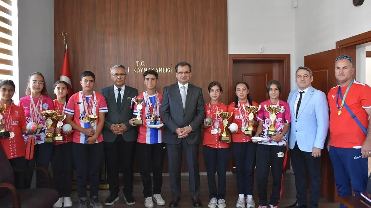 Kaymakam Ali Güldoğan başarılı sporculara tebriklerini iletti. Ziyaret sonunda okul müdürü, Kaymakam'a özel tasarım forma hediye etti.