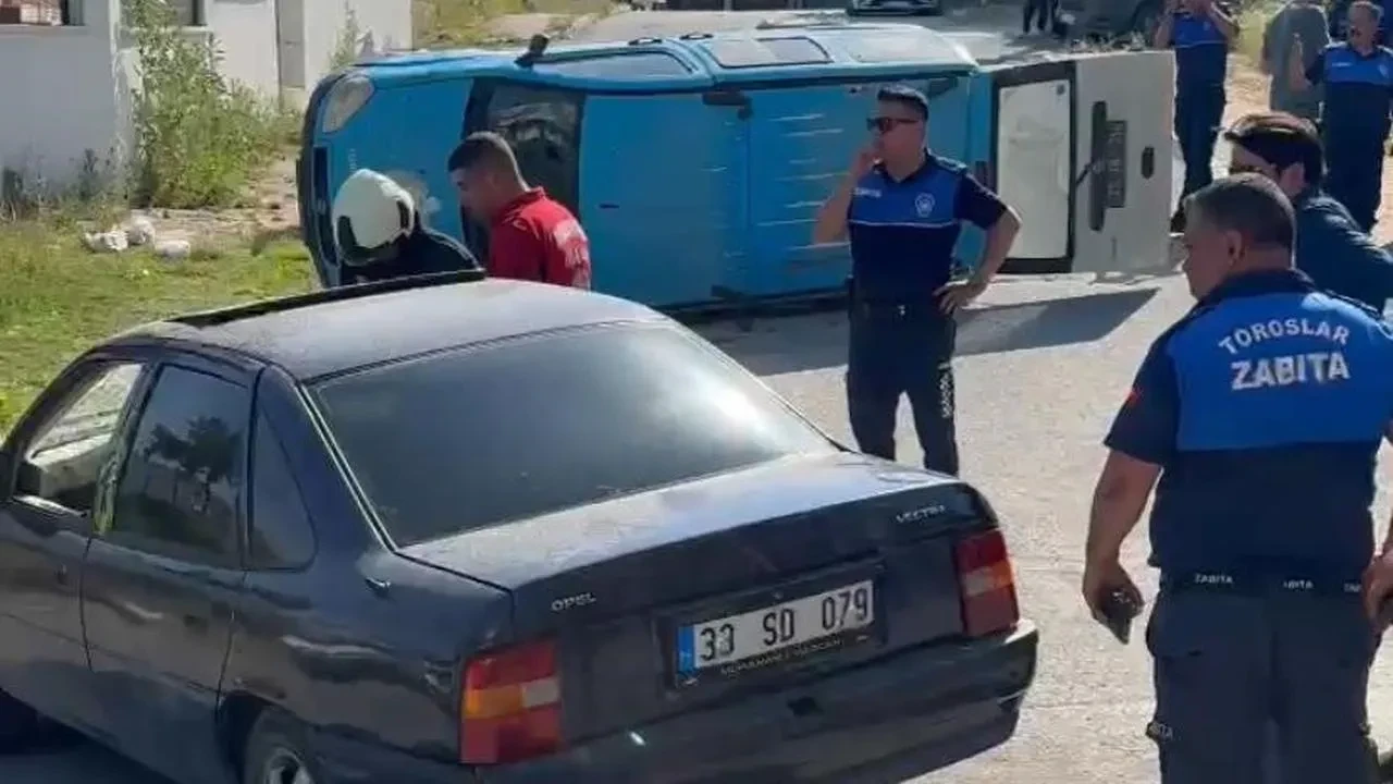 Toroslar Belediyesi'ne ait zabıta aracına çarpan otomobil, aracın devrilmesine sebep oldu. Olay, Çukurova Mahallesi'nde meydana geldi.