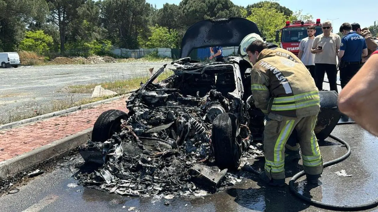 Eyüpsultan'da lüks otomobil alev aldı! 20 milyon TL'lik araç eridi