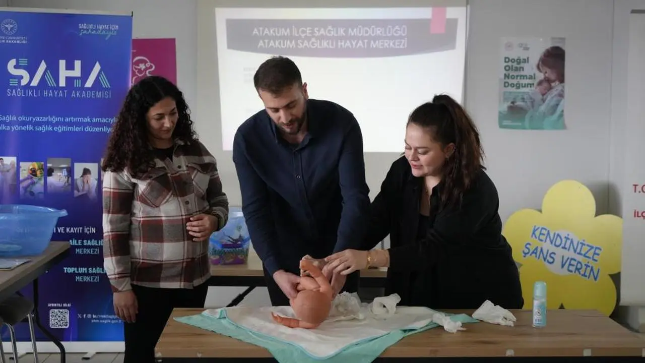 Samsun'da Sağlık Bakanlığı'nın yürüttüğü Gebe Okulu eğitimleri, baba adaylarının aktif katılımıyla renkleniyor. Anne ve baba adaylarına yönelik düzenlenen eğitimlerde, babalar bebek bakımı konusunda uygulamalı dersler alıyor. Bebek bezi değiştirme, bebek yıkama ve gaz çıkarma gibi temel becerileri öğrenen baba adayları, doğum öncesi hazırlık sürecine dahil oluyor. Eğitimler, Atakum Sağlıklı Hayat Merkezi Gebe Okulu'nda uzman sağlık personeli eşliğinde gerçekleştiriliyor.